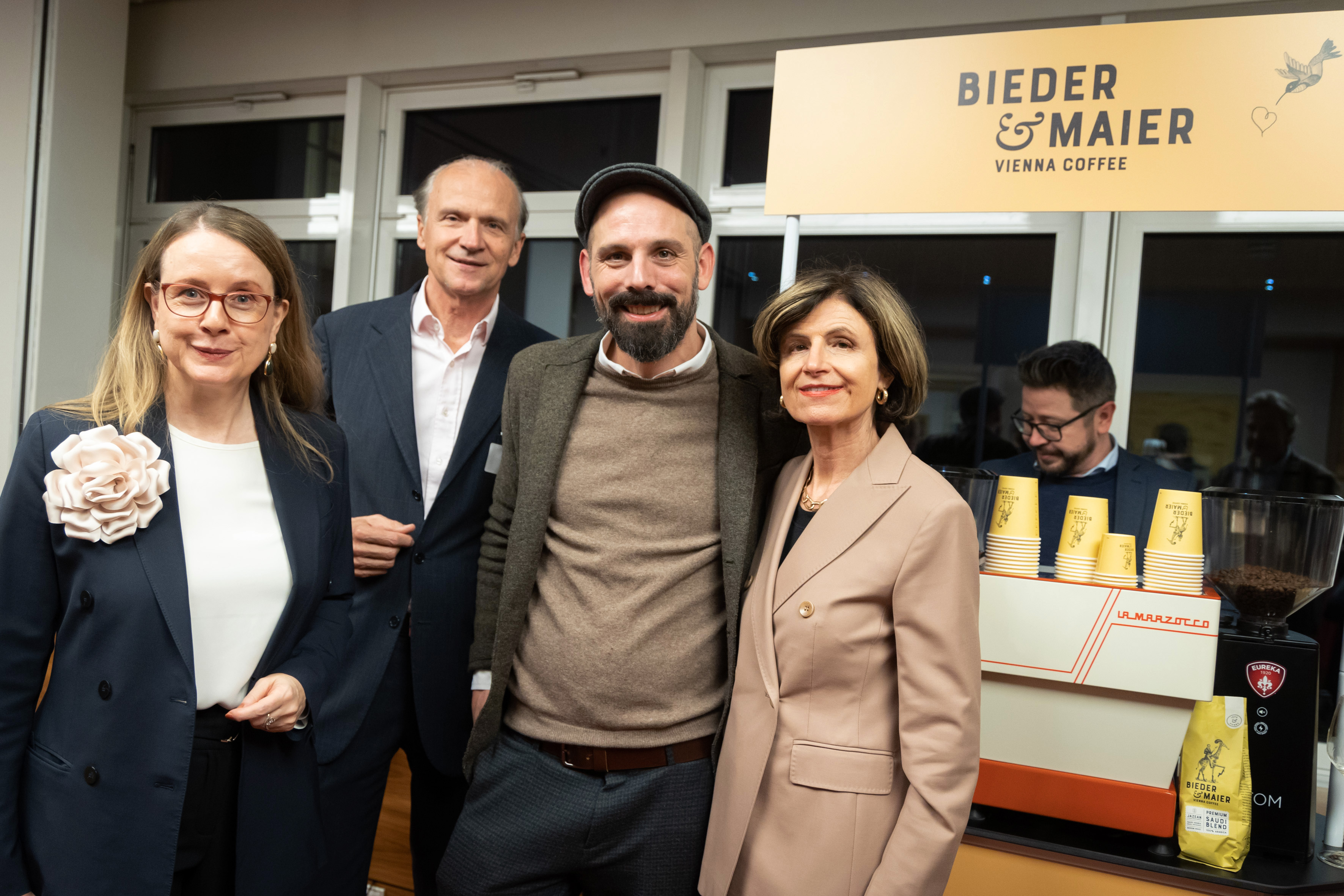 v.l.: Margarete Schramböck, Club Tirol Vorstandsmitglied Peter Kunz mit dem Geschäftsführer Valentin Siglreithmaier von "Bieder & Maier" Vienna Coffee und Club Tirol-Vizepräsidentin Renate Danler
